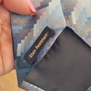 VanHeusen blue gray geometric rectangles. Handmade. 100% silk. Stain resistant - but ironically, it does have a small spot on the front, see pic. Approximately 60" long.