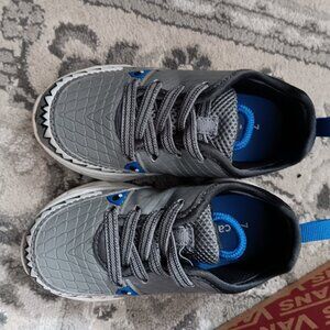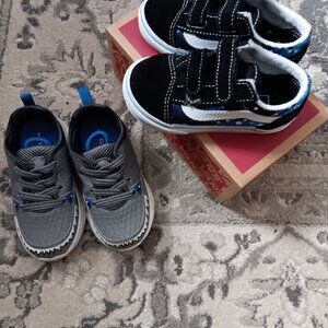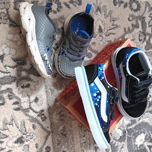 2 pairs of toddler size 7 sneakers, grey monster light up carters sneakers in excellent pre owned condition and glow in the dark velcro vans sneakers that were only worn once for photos. Brand new basically. Thanks!