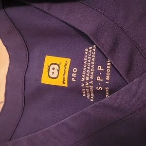 Bundle of 3 scrub sets. The peacock blue set and turquoise set are HH Works by Healing Hands and the pants have a drawstring. The navy blue set is Wonderwink Pro and the pants have an elastic waist. The color is a true navy (the photo adds a purple hue).