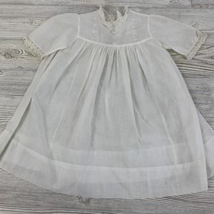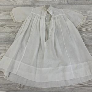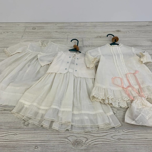 The dresses were estate-owned and are in fair vintage condition. All dresses have some issues. The christening gown has no buttons on the back, so those would need to be added. The pleated one has a small hole in the front, and the sleeveless with coverlet dress has tiny holes on one of the shoulders of the coverlet. It must have had a tear in the back at some point too because it has a substantial repair. Take a moment to look at the pictures for reference.