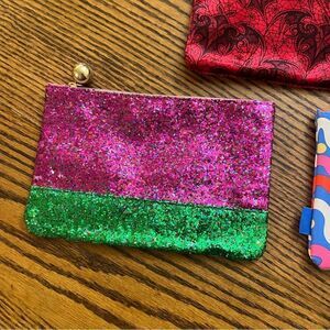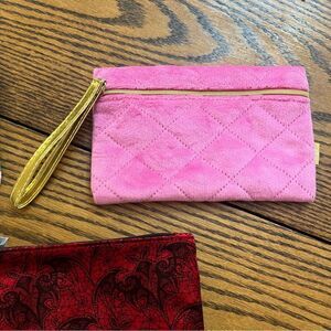 Never used! Five Ipsy makeup bags. Mostly pink (abstract, sparkly, fuzzy) and one red & black bag print.