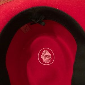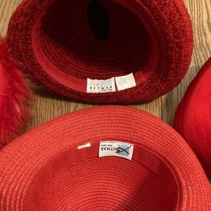 Some of the 7 hats include, betmar new york red hat with heart pin and flower clip , 100% wool felt made in usa red brim hat. Purple and red wide brim floppy mesh hat and mesh red hat with thick ribbon bow.