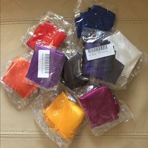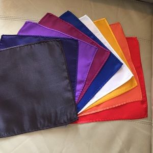 Lot of 9 polyester blend pocket squares. Each with a silk look on the front and a matte finish on the back. Size as shown- Brand new in original packaging!