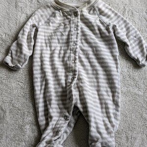 Lot of two Hanna Andersson footie pajamas with snap closures and long sleeves foldover feet/mitts. Soft, thick organic cotton in very good condition, with a little wash wear overall and some pale staining on the striped pair (see photo). One pair is pale gray and white stripes, the other is yellow with a print of kittens and mice reading. Longsleeved. Boys, girls, unisex pajamas. 0-3 months or 50 cm