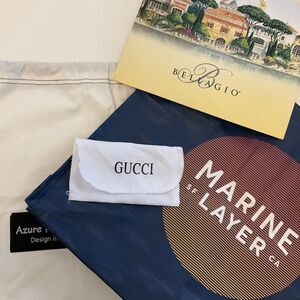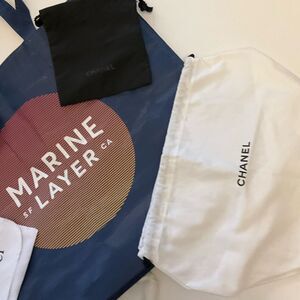 Bundle of 6 Cosmetics/tote/shoebags. Chanel drawstring pouches- one small one larger. Marine Layer reusable Tote. Bellagio paper tote, gucci lightweight pouch and Azure Milano Shoebag. All gently used or sitting in closet! #chanel #marinelayer #christmaswrap