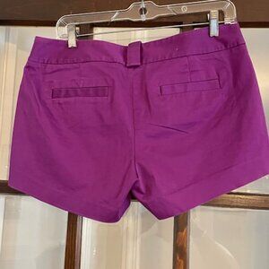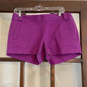 1. Great condition J.Crew purple shorts. Size 8. A little wear on the inner thighs and a little faded around the pockets (see pics) but otherwise these shorts are a great color and in great shape. Flattering side zip. 98% cotton, 2% spandex. Measurements: 17" waist, 20" hips, 11" long, 3" inseam.