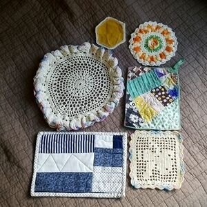 Bundle of six vintage handmade tea accessories to make a statement at your next high tea or breakfast. These fun, eclectic, and unique one-of-a-kind items are perfect for travel.