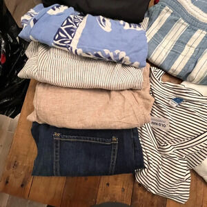 See the assorted pictures and let me know if you have any questions. I will cover anything over the five pounds in shipping charges. Most of these items are new, but there is one pair of joggers that needs the waist tie brought back through the opening to work properly. Other than that, everything is in perfect condition.