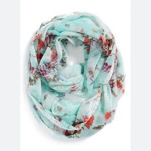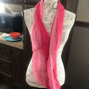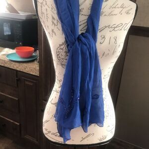 Bundle of three scarves. One is a Lulu brand scarf in blue and purple floral print. One is a solid blue scarf with beaded detail. One is a solid pink scarf. Excellent condition. No issues. A321