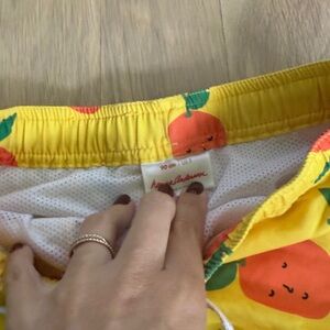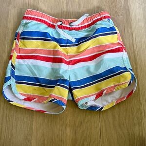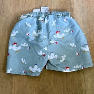 Bundle of Toddler Swim Trunks. Ducks suit is from H&M, size 3/4T, barely worn. Oranges suit is Hanna Andersson, size 3, light wear. Striped suit is also Hanna Andersson, size 3, spot on front.