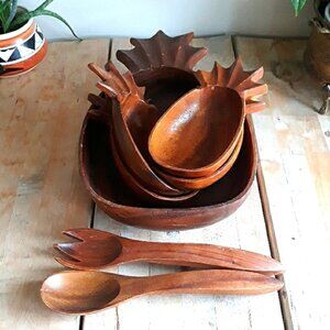 An amazing bundle of vintage monkey pod, which includes a giant pineapple serving bowl, spoon/fork, and four small pineapple bowls.