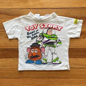 Toy Story: white t-shirt with Buzz Lightyear and Mr. Potato Head, yellow "Disney 100" tag on left sleeve