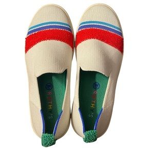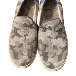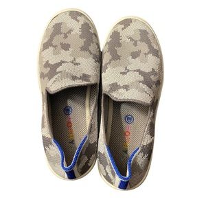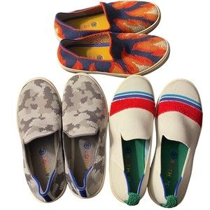 Bundle of kids’ Rothy’s slip on sneakers- gray camo, red stripe, and flame