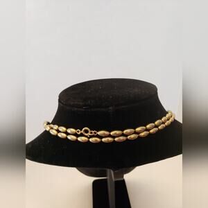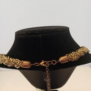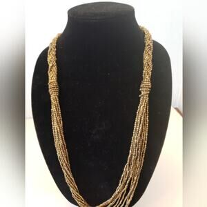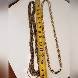 one is a gold tone beaded necklace the other is a bronze tone braided top and loose strand botto