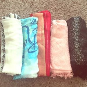 Five brand new scarves different colors black, pink, red, blue and cream. Never used some off them with tags.