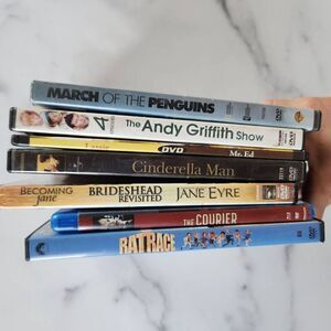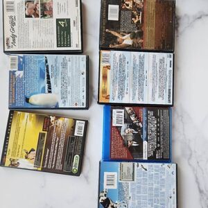 Seven empty DVD cases with movie titles from rat race Cinderella Man Lassie March of the penguins and more