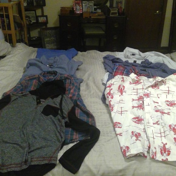 The Distortion hoodie has never been worn. The light weight hoodie is gray and black with maroon trim (M). Three of the button downs are Polo Jeans Company (L). One solid blue pull over and one short sleeved lobster print shirt (XL). Clothes are in good condition.