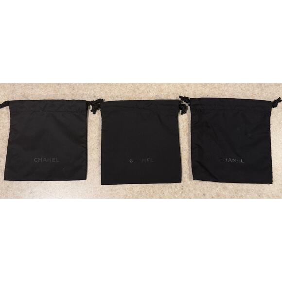 This is a charming bundle of three authentic Chanel black drawstring pouches, perfect for storing jewelry, samples, or cosmetics. These stylish pouches add a touch of luxury to your organization.