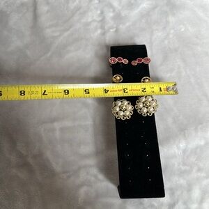 Chic earring set featuring pink and gold tones. Includes pearl accents for a classic touch.