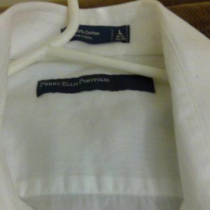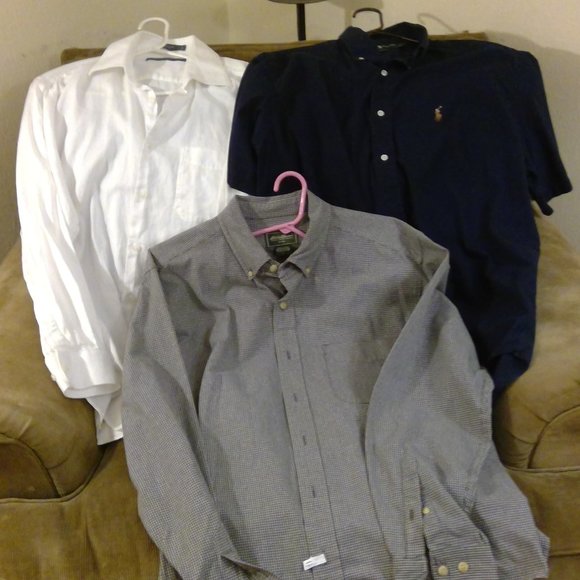 The Eddie Bauer shirt is in excellent condition. Like new. Checked/ striped pattern. Green and white button down long sleeve shirt. Blue, short sleeved Polo shirt (large) and a white long sleeved shirt by Perry Ellis. Polo and Perry Ellis shirts are in good condition also.