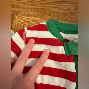 1) Hanna Andersson size 80cm (18-24 months) red and white striped one piece pajamas with green trim, note stains that I have photographed