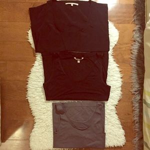If you’re like me, you always need more good tops to wear under blazers and sheer blouses to work. This set includes one Collective Concepts black sleeveless tank with pretty pleating and light lace detail at front, one Banana Republic black tank with satin trim and one smoke gray Shimera cami from Nordstrom. All size M and in EUC.