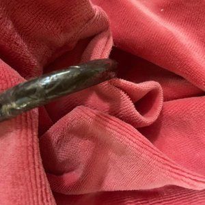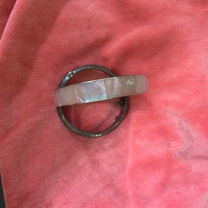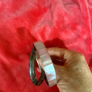 2 vintage bangle bracelets. Both are from mid-late 80's. One is a shell-inlay bracelet bought in the open-air market in Charleston, SC, and the other is a hinged silver bracelet with some engraving. Silver bangle's chain needs to be reattached. Silver bangle is tarnished.