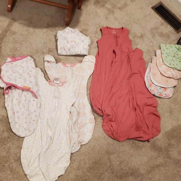 Swaddling made easy! Two M Wearable zip up blankets from Carters size M and two swaddle designs transitional velcro swaddles both size M 3-6 months. Bundle also includes newborn swaddle, unicorn boppy cover and 4 burp cloths. All in like new condition used a handful of times - no stains!