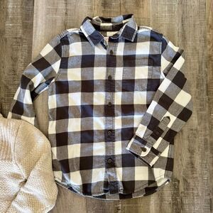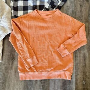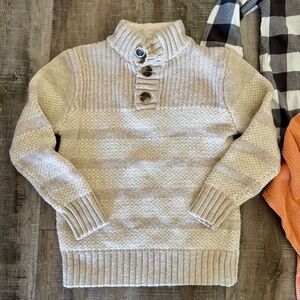 This stylish kids sweater set includes an orange waffle knit shirt, a cream chunky knit sweater, and a grey checkered flannel shirt. All gently worn and in excellent condition. No stains or tears.