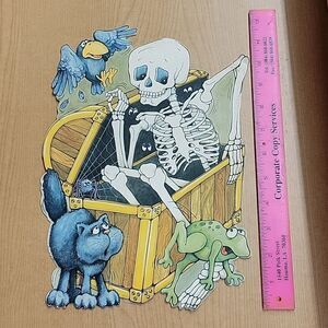 Bundle of Hallmark vintage double sided Halloween decorations. Included are 5 wall/ window paper decorations and a 36" cute kitty banner. The bear and haunted house are 2 sided the rest are just one sided. Nice addition to your Halloween decor.