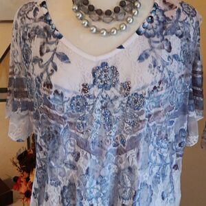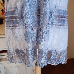 1. Blue and sparkly on sheer net over printed lining. Short sleeves