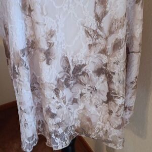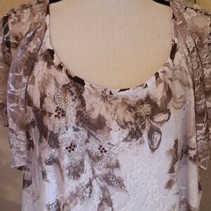 2. Beige cream sparkly on sheer net over printed lining. Raglan sleeves.