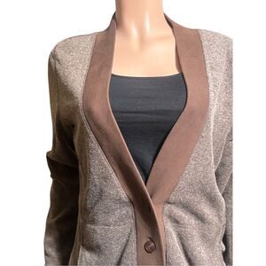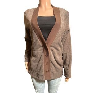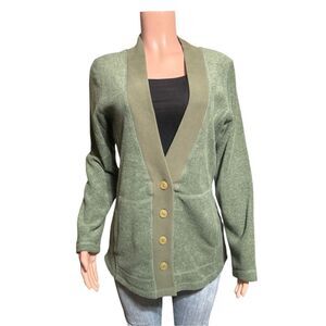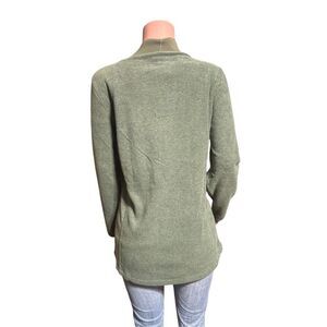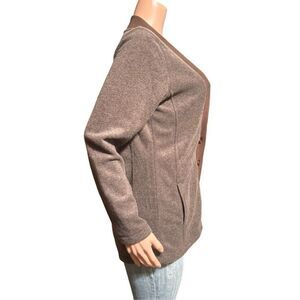 Button front ribbed on the front with fleece and pockets. Casual relax lightweight sweater no inside tag