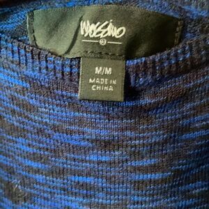 Blue and black worn once and laundered - no flaws. Double split hem. Approx 18” pit to pit, 60” shoulder to hem.