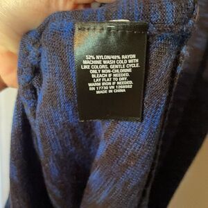 Blue and black worn once and laundered - no flaws. Double split hem. Approx 18” pit to pit, 60” shoulder to hem.