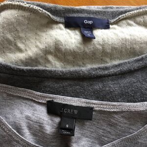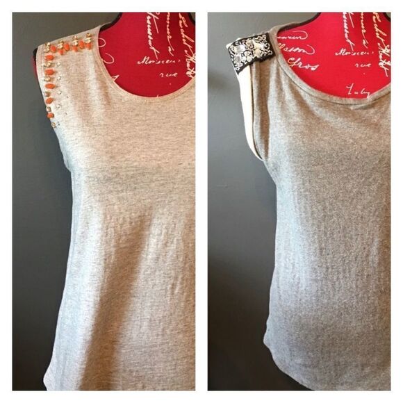 Listing includes BOTH shirts! muscle tees from J. Crew and Gap. J. Crew shirt is detailed with orange, gold and clear rhinestones (all stones are intact, however, one stitch of one stone has come loose - see last pic - just needs to be sewn to secure it, easy fix). The Gap shirt has light pilling from wear, no missing or loose stones/beads. J. Crew shirt is a small, Gap shirt is a medium but BOTH shirts are 18" pit to pit and 26" shoulder to hem. Both could fit a S or M.