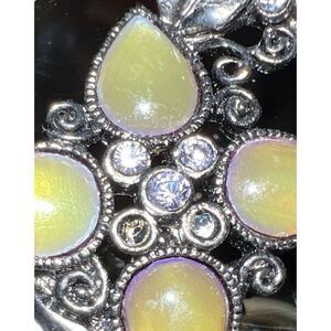 This brooch features six pear-shaped yellow stones arranged in a symmetrical flower pattern. The center is accented with four tiny clear rhinestones—two of which are missing. Despite the minor flaw, the piece remains visually striking and structurally sound.