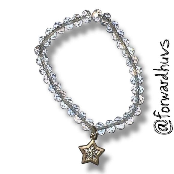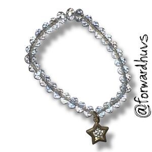 This elegant stretch bracelet features a strand of clear faceted beads that reflect light beautifully, creating a sparkling and refined look. At the center hangs a metallic star-shaped charm, encrusted with rhinestones for added brilliance. The bracelet is designed with a comfortable stretch fit.