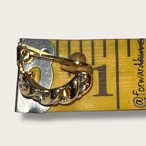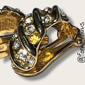 This is a nice pair of gold tone clip on earrings which have rhinestones placed throughout. This vintage pair of earrings are missing some rhinestones as you can see in photos.