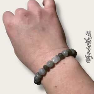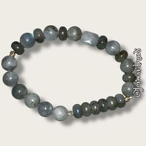 This is a stretch bracelet, which is made of faceted stone in different shapes. There are are both round and square stone beads and then some narrow oval shape beads.