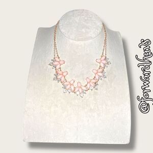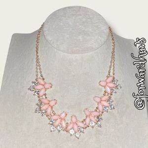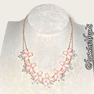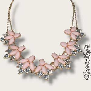 This stylish necklace features a gold-tone chain adorned with pink teardrop-shaped stones arranged in a floral pattern. Clear round stones are interspersed among the pink accents, adding a touch of sparkle and elegance. The necklace measures approximately 16 inches in length with a 3-inch extension, allowing for adjustable wear.