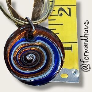 Add a vibrant artistic touch to your jewelry collection with this handcrafted glass pendant necklace. The circular pendant features a striking spiral design in shades of blue, orange, and gold.