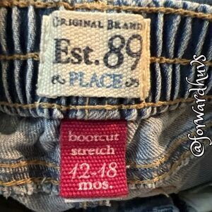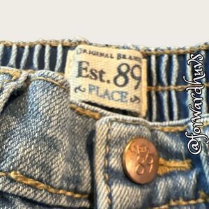 This is a pair of original brand est. 89 Place boot cut stretch denim jeans in size 12 to 18 months. These are fantastic and super cute. They are light acid wash jeans with two front pockets and two back pockets. There is an adjustable waist with elastic built-in for a better fit. A single button closes these jeans with a front zipper. There are five belt loops as well. These do have some signs of wear, but nothing major.