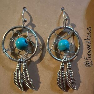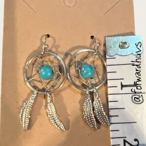 These silver tone dangle earrings feature an intricate dreamcatcher design with two delicate feathers hanging freely from each dreamcatcher. A vibrant turquoise bead sits at the center, adding a pop of color to the detailed silver tone metalwork. The earrings are designed with fishhook wires for easy wear and include plastic back stops for added security.