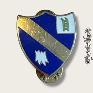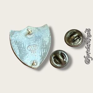 This distinctive shield-shaped pin is crafted from silver tone metal and features bold enamel detailing.