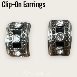 This is a listing for a beautiful pair of clip on earrings covered in rhinestones. These are silver tone with a black enamel and clear rhinestone. The clips hold tight and are firmly in place.