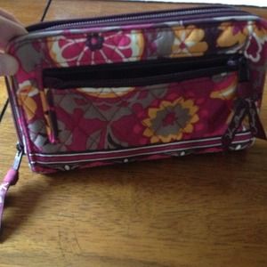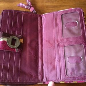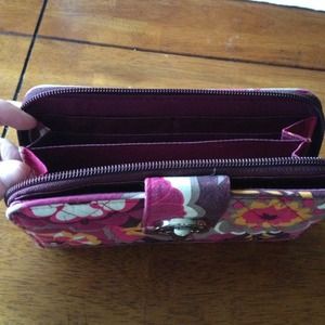 Cute Vera Bradley wallet. Zip up cash/check area with 6 card spots. Open buckle area has room for license, id and 8 more card spots plus two large bill or recite pockets. Back of wallet has zip up coin pocket. Excellent shape