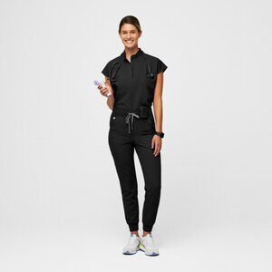 FIGS Women’s Scrub Set – 4 pieces in black, Size M. Includes Catarina, Rafaela, Salta tops + Zamora jogger pants. Excellent condition, clean, no flaws.