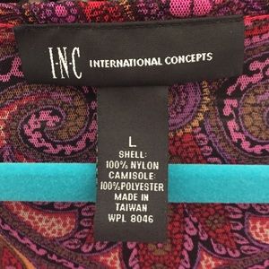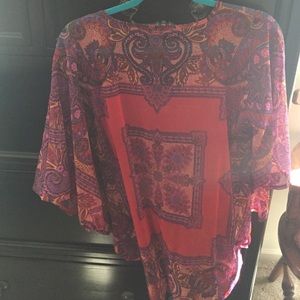 Shear butterfly top with multicolored of red and purple. Embellished with silver accents in front. Great top for the spring. Very flowy.
