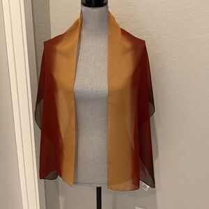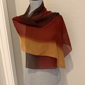 Pretty bundle of fashion scarves are perfect for accenting any outfit. Lightweight. They consist of one eggplant color with large flowers. One black and white striped. One ombré with gold, burnt orange and brown. Pre-loved, good condition. Average width is 13”.
